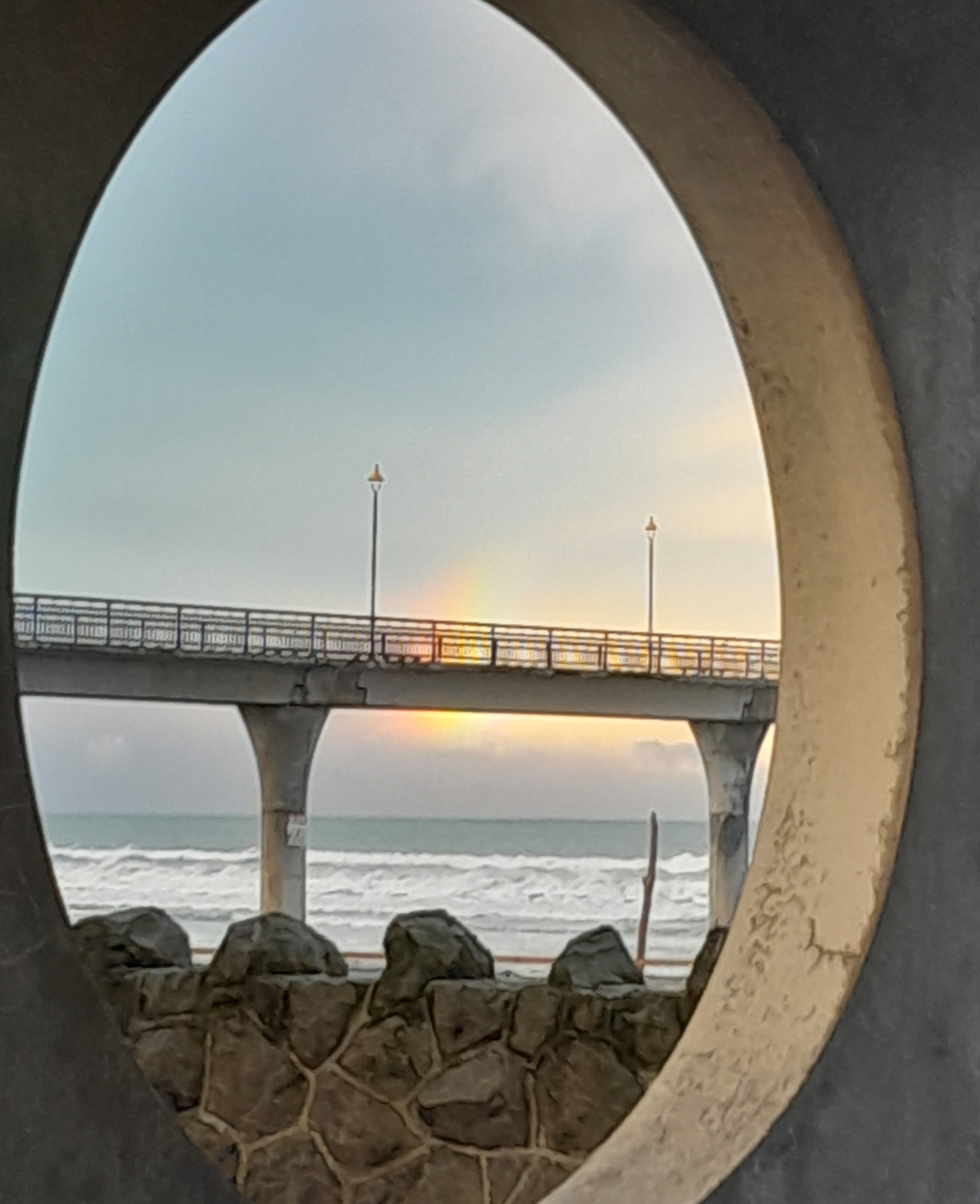 Yesterday’s photo was taken at New Brighton, Christchurch, through a concrete window with a rainbow in the distance.