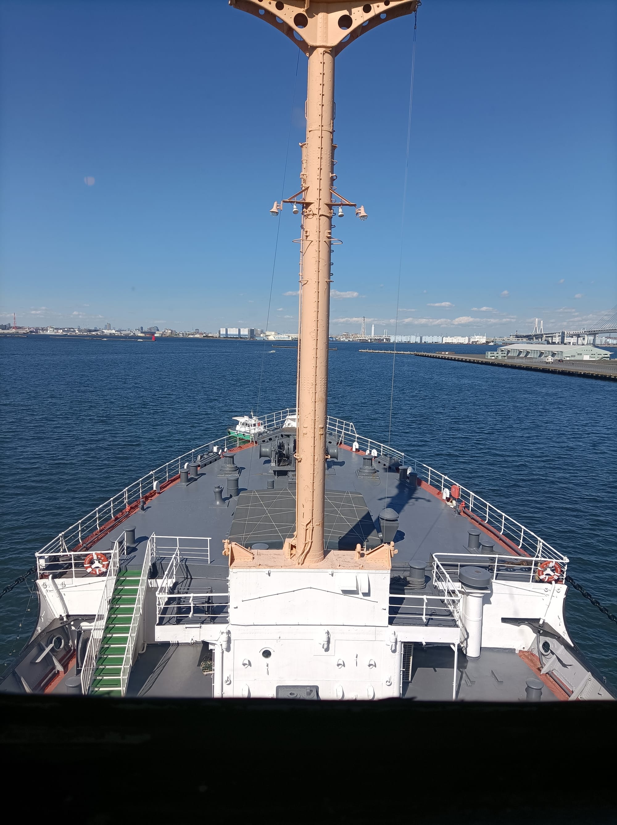 Yesterday’s photo was the view from the Bridge of the Hikawa Maru (93-year-old historic ship, open to tourists) looking out to Yokohama Harbour.
