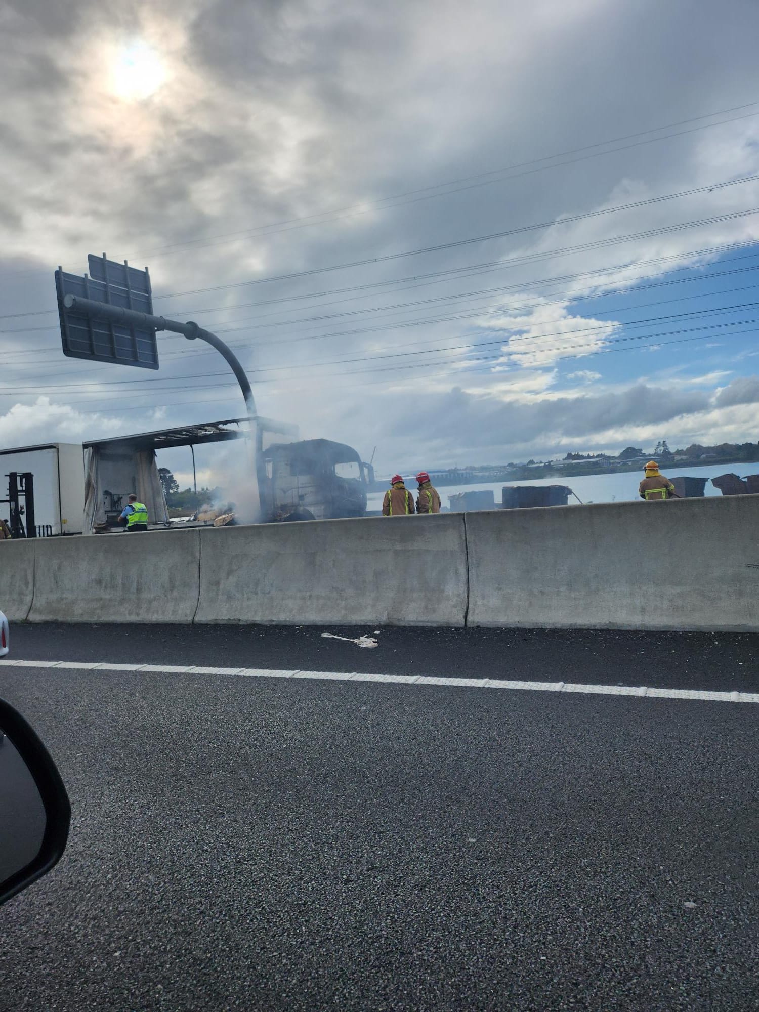 This photo is a view of another exciting day on the southern carpark. Southbound just before the Papakura off ramp, Pahurehure Inlet as a back drop.