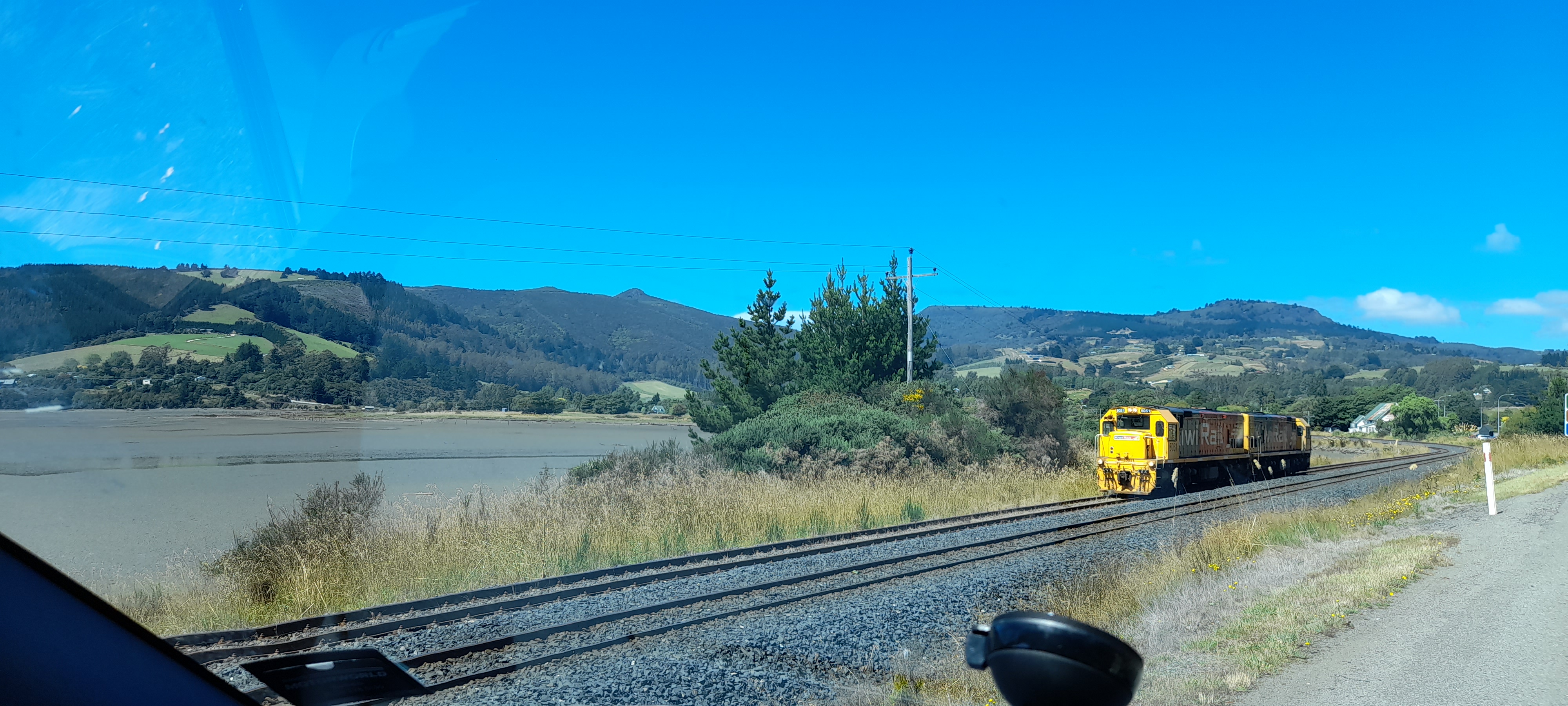 Yesterday’s photo was a view from SH1 at Waitati, Otago, looking over the main trunk line to Blueskin Bay.