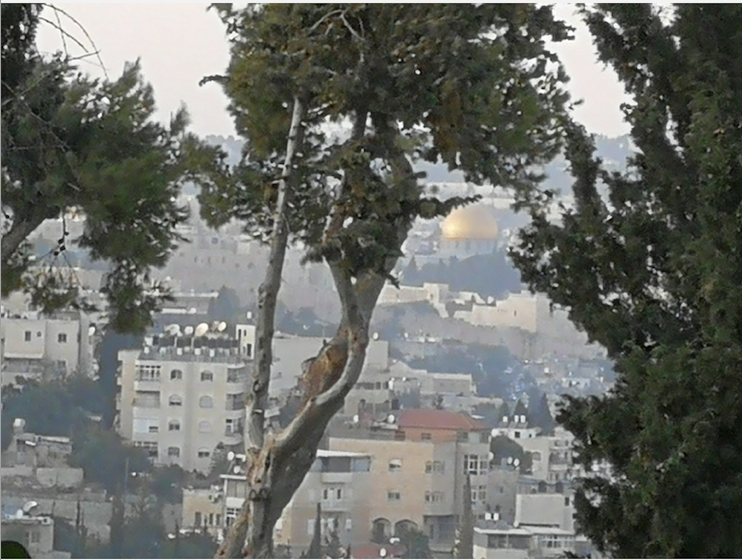 Yesterday’s photo was the view from a reader’s living room. It looks back from South East Jerusalem (North Talpiyot) over the mixed Jewish Arab Suburb of Abu Tor toward the Western Wall with the Mosque of Omar standing above it on the Temple Mount.