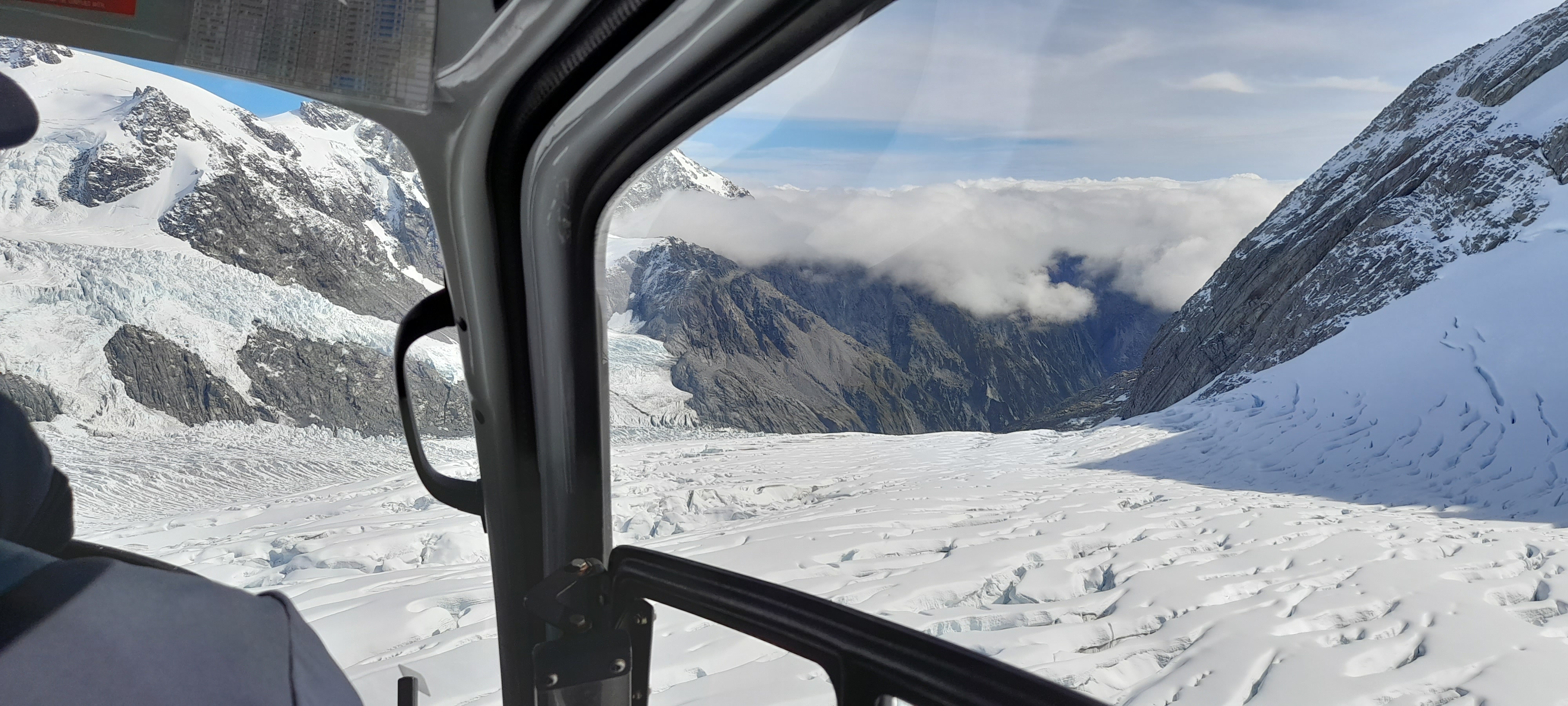 Yesterday’s photo was the view from Franz Josef glacier looking west. It was taken from an AS350 Squirrel tourist helicopter.