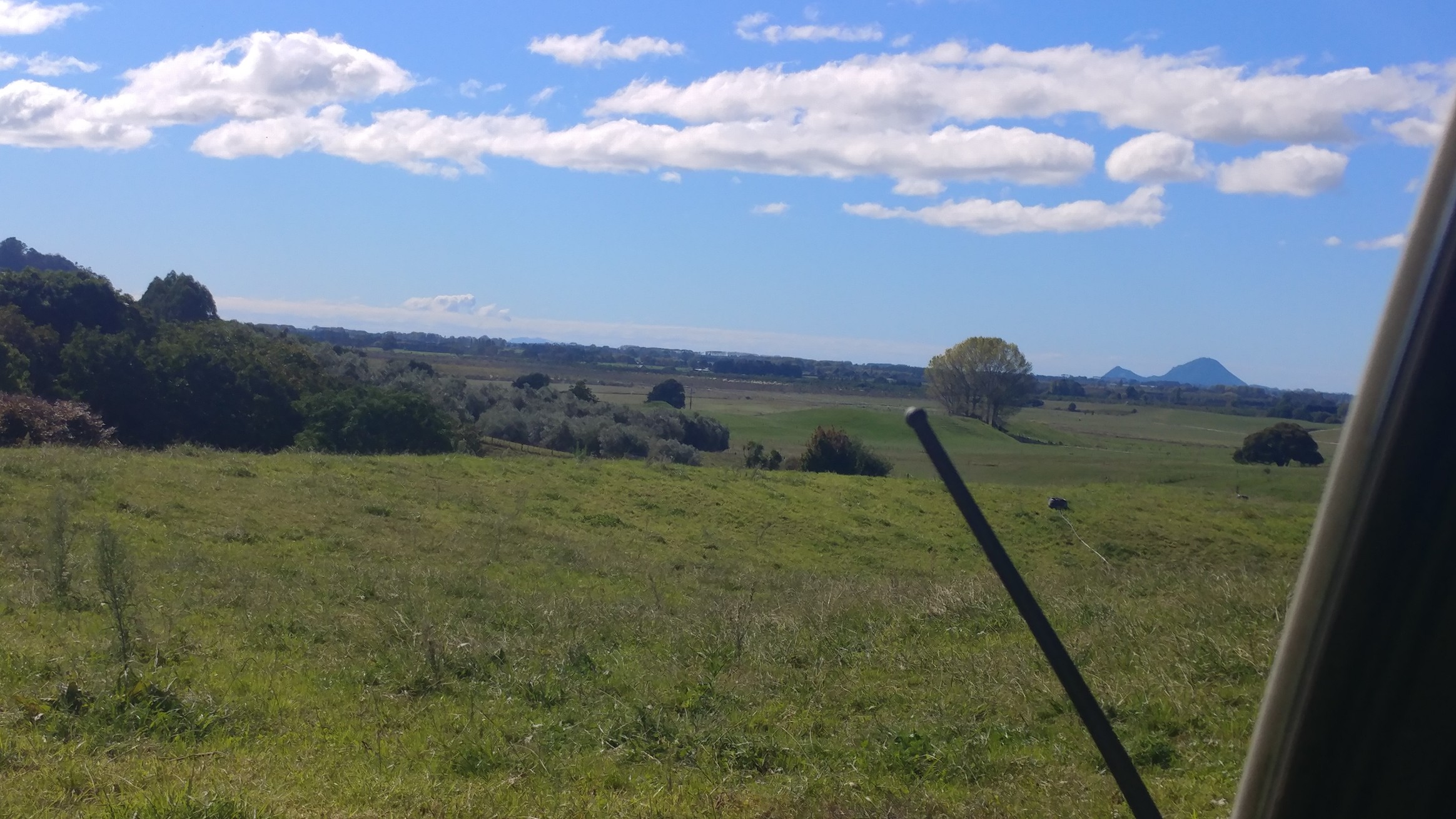 Lunchtime on a farm off Braemar Road looking across the Rangitaiki plains to White and Whale islands in the Bay of Plenty.