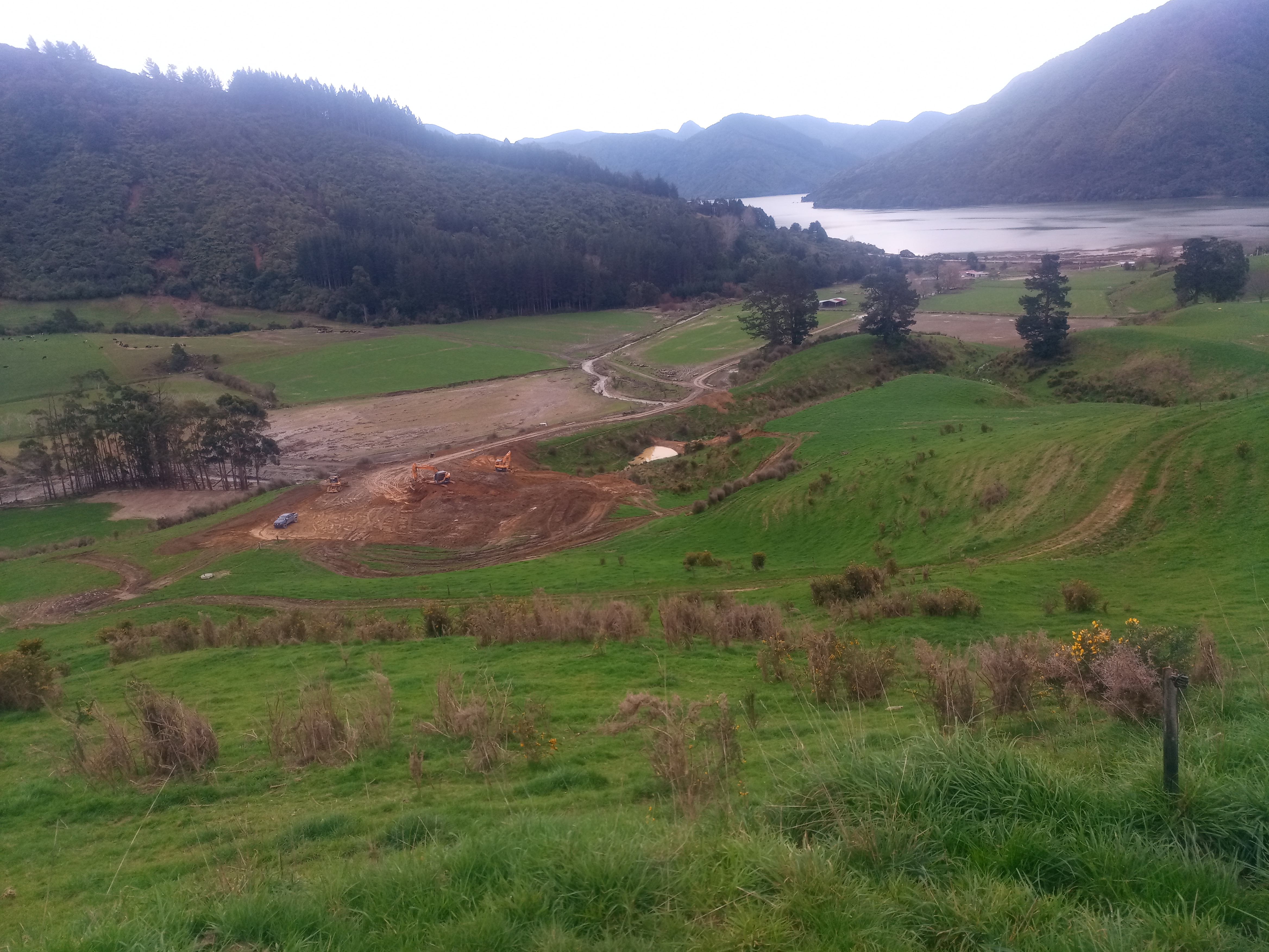 Yesterday’s photo was a view of the dump site set up on our farm on Queen Charlotte Drive to take the debris from the recent floods. Looking down on Mahakapawa arm of Pelorus Sound.