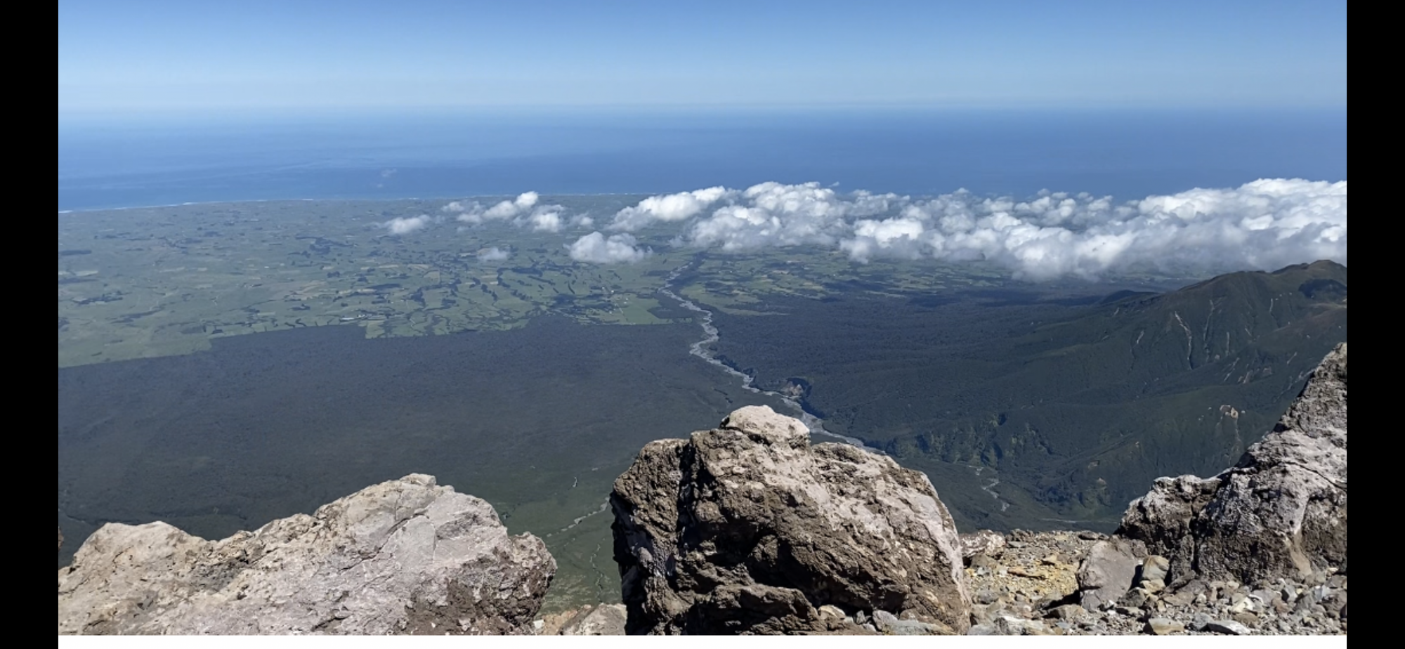 Yesterday’s photo was looking west from the summit of Mt Taranaki with the headwaters of the Stony river flowing towards Okato. Cows For Me farmed to the left of this photo.