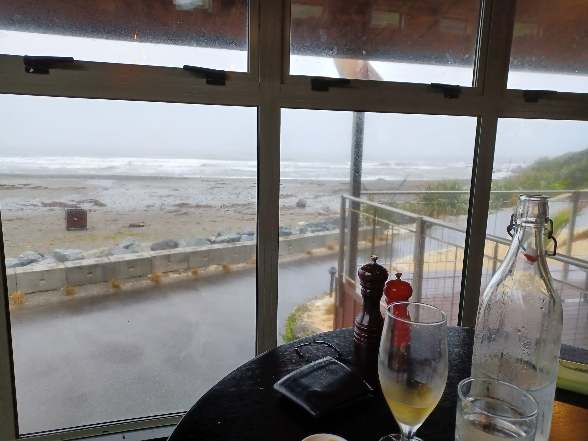 Yesterday’s view was of an early evening dinner at the Punakaiki Retreat restaurant. Great views of the Tasman rolling in.
