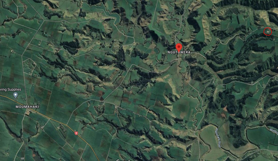 Ngutuwera is inland from Moumahaki which is halfway between Waitotara and Waverley on SH3. The red circle is where I grew up.