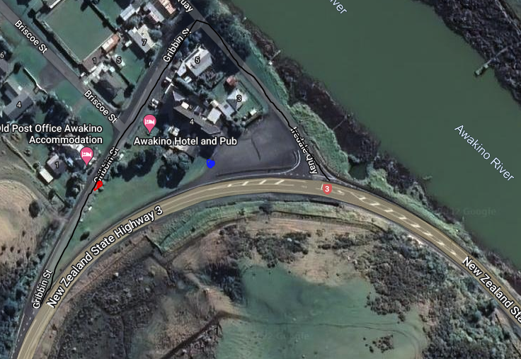 The road used to go thru Awakino (as shown by the black line below) but now uses this bypass