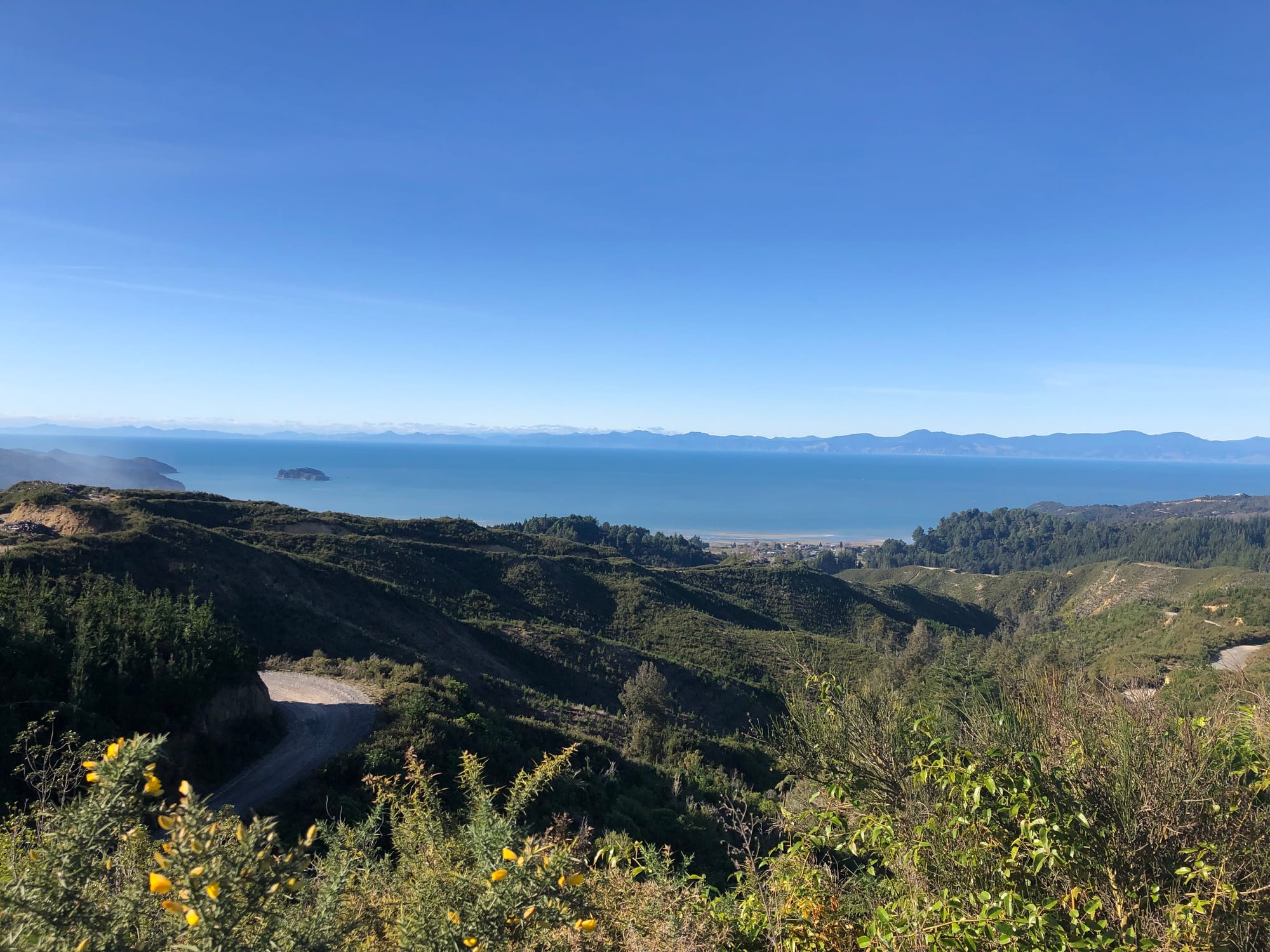 Yesterday’s photo was taken from the window of my pack, I’m afraid, not exactly a window: a much wider perspective. Yesterday down here was glorious after weeks of rain. Just the day to push boundaries and, finding the gates to the Marahau forest wide open, what’s a free spirit to do? Me and my pack are up near the top of the Takaka Hills looking across the Marahau forest (it’s a man-made forest and history will show it to be quite destructive) towards Croisilles Harbour and D’Urville Island.
