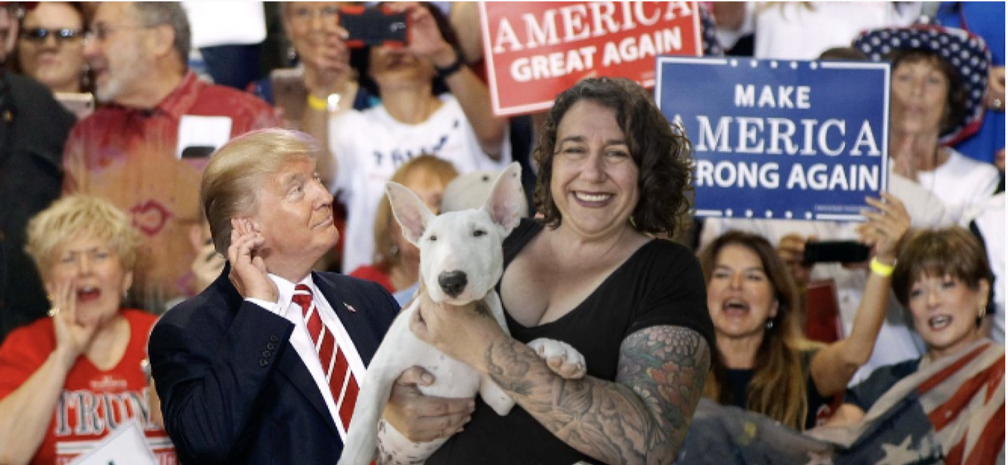 The BFD. Virginia Fallon & pet with a background of Trump and Trump supporters. Photoshopped image credit SB