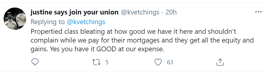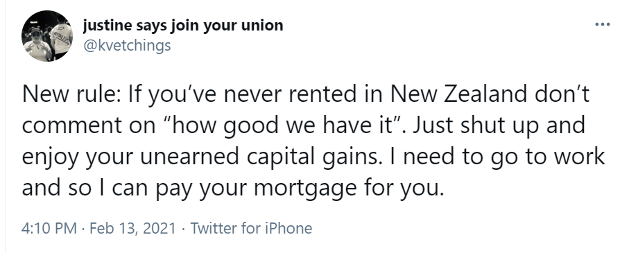 What ‘justinesaysjoinyourunion’ fails to see is that the government has deliberately slanted everything away from landlords, yet they continue to profit because so many landlords have sold up, taken their handsome capital gains, and left the market with fewer available properties. There is now a CGT payable on an investment property if sold within 5 years of purchase, losses cannot be offset against other income, depreciation cannot be claimed, insulation costs are not deductible, rents can only be increased once a year and landlords cannot give notice without a good reason.