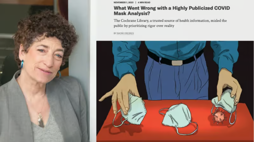 Naomi Oreskes, well-known science historian and co-author of Merchants of Doubt, argues that the public was “misled” by the 2023 Cochrane review, which concluded that wearing a face mask “probably makes little or no difference” in preventing SARS-CoV-2 transmission.