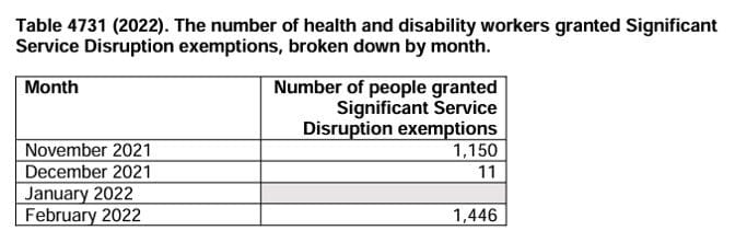 Recent OIA requests have revealed that these Significant Service Disruption (SSD) exemptions were granted for a very large number of healthcare workers – 11,005 in total.