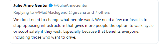 We don’t need to change what people want. We need a few car fascists to stop opposing infrastructure that gives more people the option to walk, cycle or scoot safely if they wish. Especially because that benefits everyone, including those who want to drive.end quote.