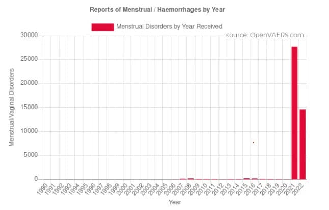 Now I found something very worrying indeed. In the VAERS database from the U.S, there has been an astronomical 31 020% increase in reports of menstrual disorders in 2021 after the mRNA vaccines came out. Clearly, something is wrong here.