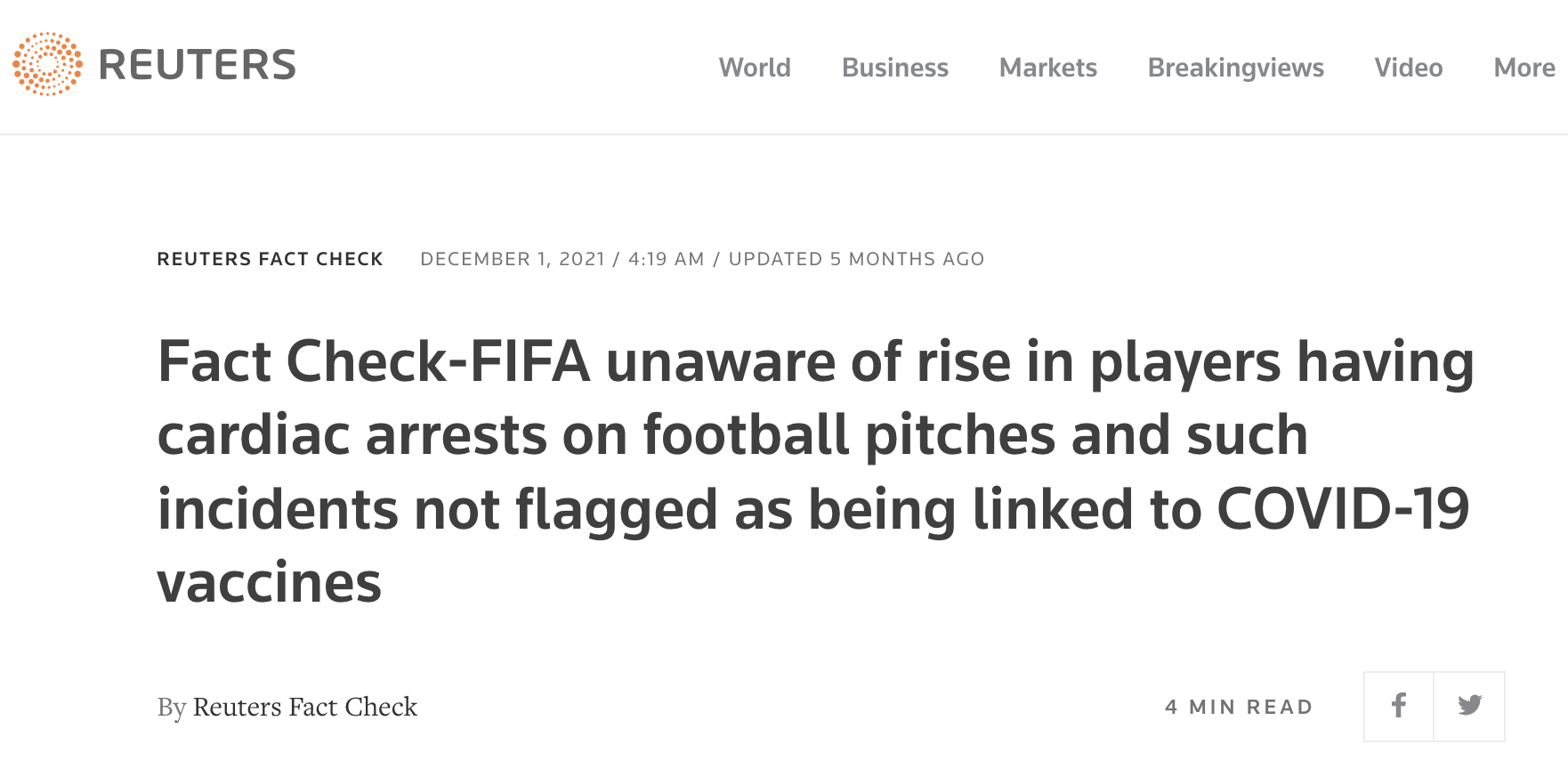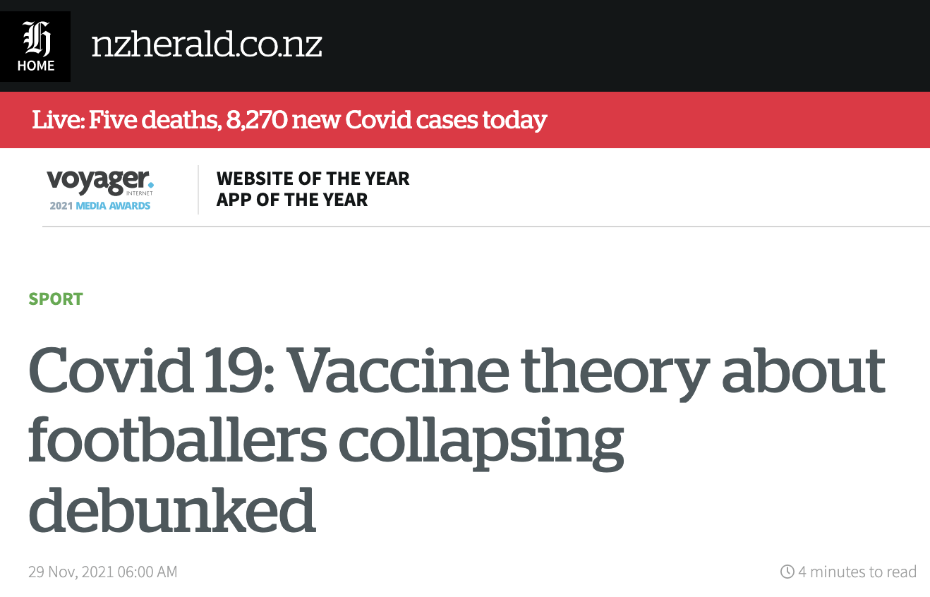 Their story relied heavily on a discussion of a single Danish footballer Christian Eriksen who suffered a cardiac arrest on June 12 2021 just before halftime. The circulation of the apparently false story that Eriksen had been vaccinated was attributed by the Washington Post to a shady far-right group in Austria seeking to influence their upcoming election. The pro-vaxxers cheered from the stands.