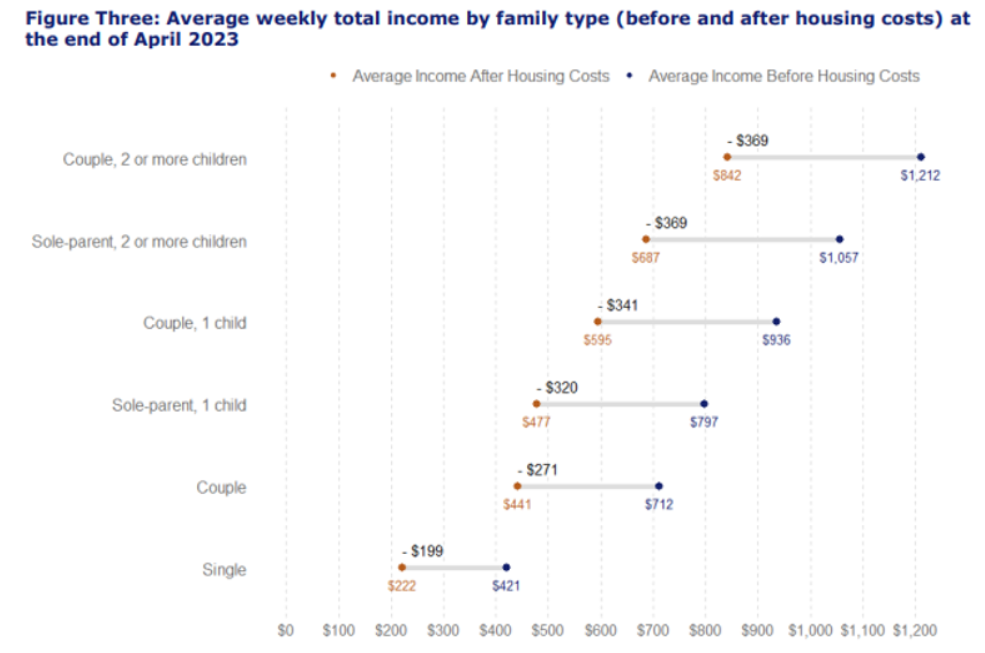 Here is a chart from the latest report. It shows that the average benefit income for a couple with two or more children is now $1212 weekly or $5,252 monthly. This is net. For more detail read the report.