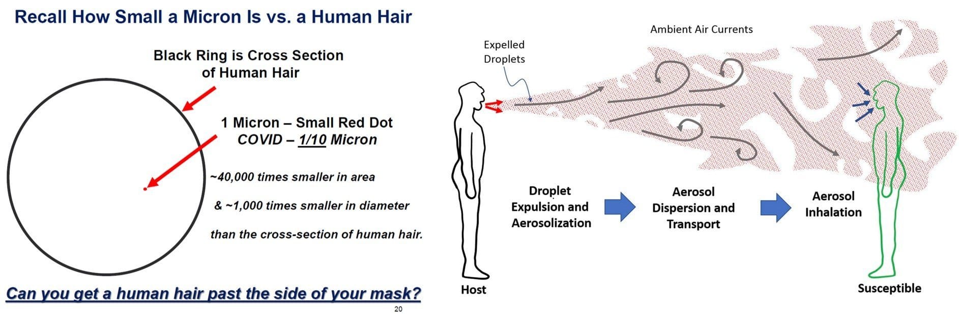 After being exhaled into the environment, airborne viruses can become suspended in tiny dehydrated particles of dust called aerosols. Magnitudes tinier than the apertures in a face mask, infected aerosols can float on air currents for hours to days. Their size and persistence make face masks useless against aerosol transmission.