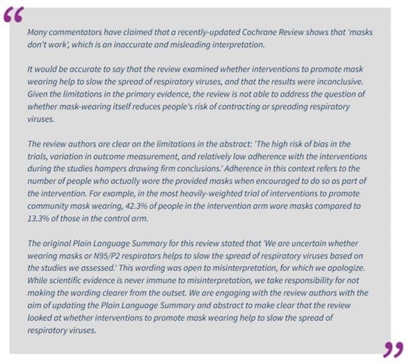 The Cochrane Library’s systematic review on non-pharmaceutical interventions concluded that “wearing masks in the community probably makes little or no difference to the outcome of influenza?like illness (ILI)/COVID?19 like illness compared to not wearing masks…” On 10 March 2023 Tufekci wrote a direct rebuttal: Here’s Why the Science Is Clear That Masks Work, including what Dr Jefferson has called an attack on his scientific reputation. The rebuttal is summarised by Maryanne Demasi as “despite no high-quality data, we could conclude, based on poor evidence, that masks do work.“