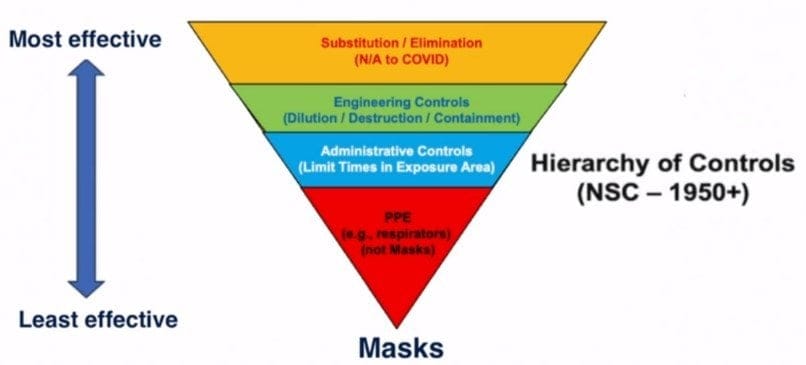 As described by Petty, the most effective interventions at stopping the spread of aerosols are engineering controls to dilute, destroy or contain a harmful organism. Examples include adequate ventilation to dilute the concentration of aerosols, and HEPA filters such as those used in commercial aircraft and medical laboratories to circulate air and trap infected particles. The least effective controls are personal protective equipment used by individuals. Petty explains why face masks (as opposed to sealed respirators) are not considered to be effective PPE, and therefore sit outside the hierarchy of controls.