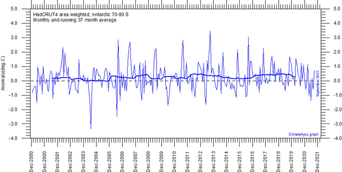 Diagram showing area weighted Antarctic (70-90 N) monthly surface air temperature anomalies (HadCRUT4) since January 2000, in relation to the WMO normal period 1961-1990. The thin line shows the monthly temperature anomaly, while the thicker line shows the running 37-month (c. 3 year) average. The chart shows little change over the last 20 years.