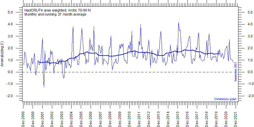 The chart shows area weighted Arctic (70-90 degrees N) monthly surface air temperature anomalies (HadCRUT4) since January 2000, in relation to the WMO normal period 1961-1990.