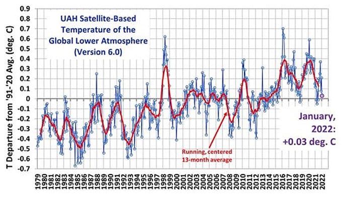 The latest global average temperatures of the troposphere updated to January 2021 – observed from US National Oceanic and Atmospheric Administration satellites – are computed by the University of Alabama at Huntsville in the United States. The data shows variations from the 30 year period 1981-2010.