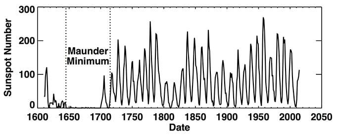 There is evidence the sun had similar periods of inactivity during the years 1100-1250 and 1460-1550. Sunspots generally follow a cycle of about 11 years, but cycles have varied from eight-15 years. The connection between solar activity and the earth’s climate is an area of ongoing and sometimes controversial research.