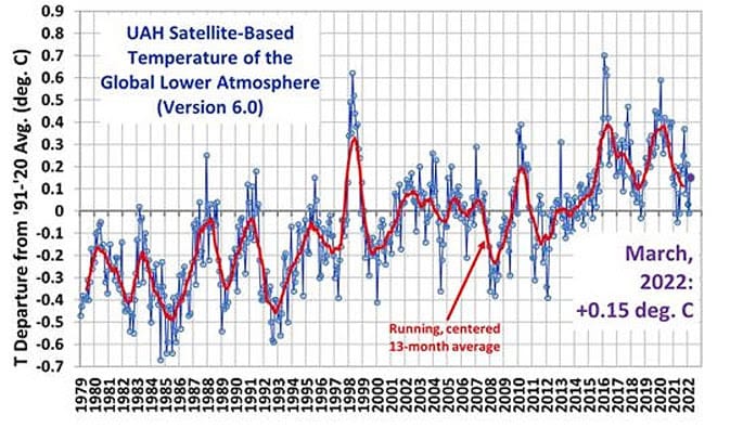 The latest global average temperatures of the troposphere updated to March 2022 – observed from US National Oceanic and Atmospheric Administration satellites – are computed by the University of Alabama at Huntsville in the United States. The data shows variations from the 30 year period 1981-2010.