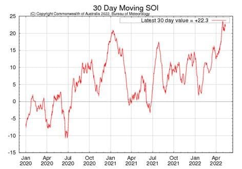The graph below ( from the Australian Bureau of Meteorology, BOM) shows monthly values of the SOI from January 2020 to May 2022.
