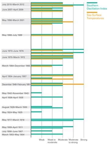 Atmospheric and oceanic intensity of La Niña events since 1900. Intensity is ranked by SOI values for atmosphere, while oceanic intensity is ranked by sea surface temperature indicators (only available reliably since mid-century). Some multi-year events have two or three La Niña peaks.