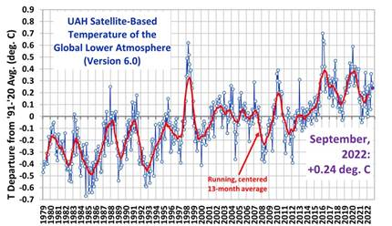 The latest global average temperatures of the troposphere updated to September 2022 – observed from US National Oceanic and Atmospheric Administration satellites – are computed by the University of Alabama at Huntsville in the United States. The data shows variations from the 30-year period 1981-2010.
