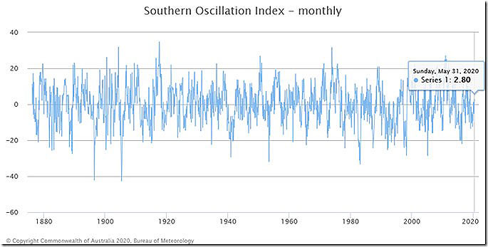 The graph below ( from the Australian Bureau of Meteorology, BOM) shows monthly values of the SOI from 1880 to April 2020.