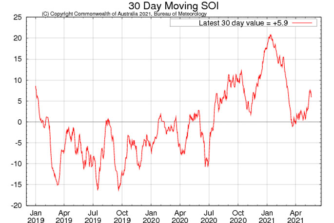 The graph below ( from the Australian Bureau of Meteorology, BOM) shows monthly values of the SOI from January 2018 to mid-May 2021.