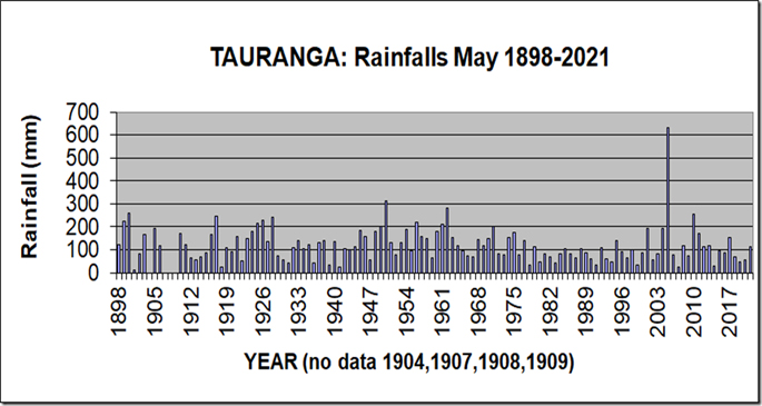 Rainfalls for the month of May have been recorded in Tauranga since 1898 – except for 1904, 1907, 1908, and 1909.