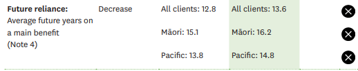 Unlike the previous National government, the Labour government did not set an official target of reducing dependency. Rather MSD measures their ‘success’ in building trust and confidence in clients; in timeliness of access and availability of assistance; in equity of outcomes for Maori; client satisfaction with family violence services; and in building awareness of and access to support.