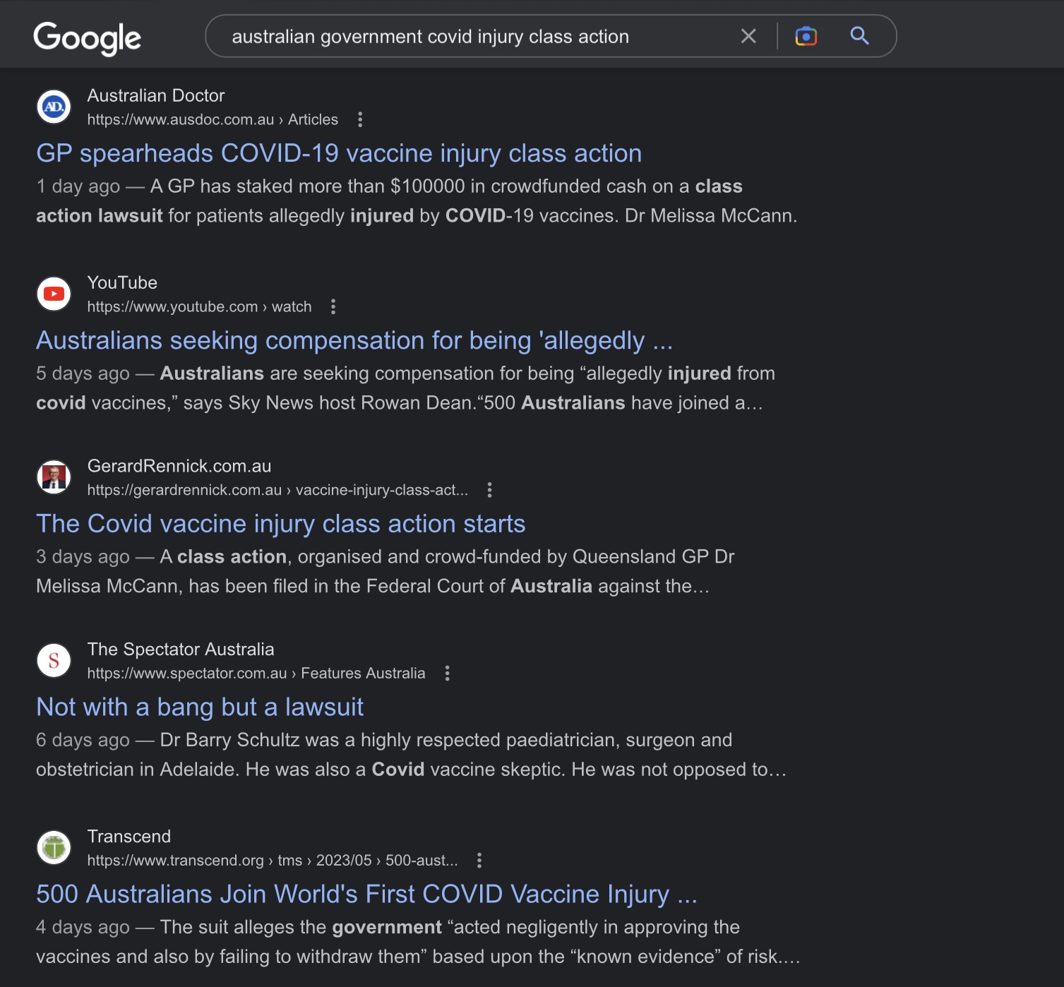 Let’s try a wider Google search for ‘Australian government Covid injury class action’ in the time frame of ‘last week’:
