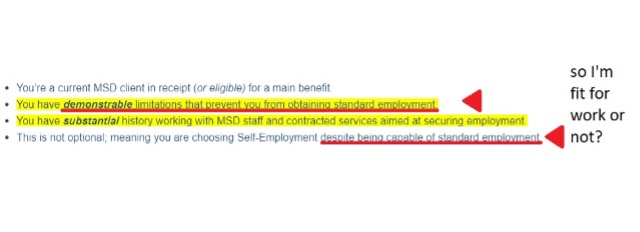 As discussed with the representative, had I lacked a standard working history, graduate qualification and short-term beneficiary status, I’d instantly be better positioned for WINZ favouritism under this scheme, the Business Training and Advice Grant and the self-employment start up payment (all of which demand similarly grim circumstances). How ironic when working and studying develop problem-solving and critical thinking abilities to varying degrees, besides demonstrating what should be sufficient motivation to complete the paperwork required in the applications.
