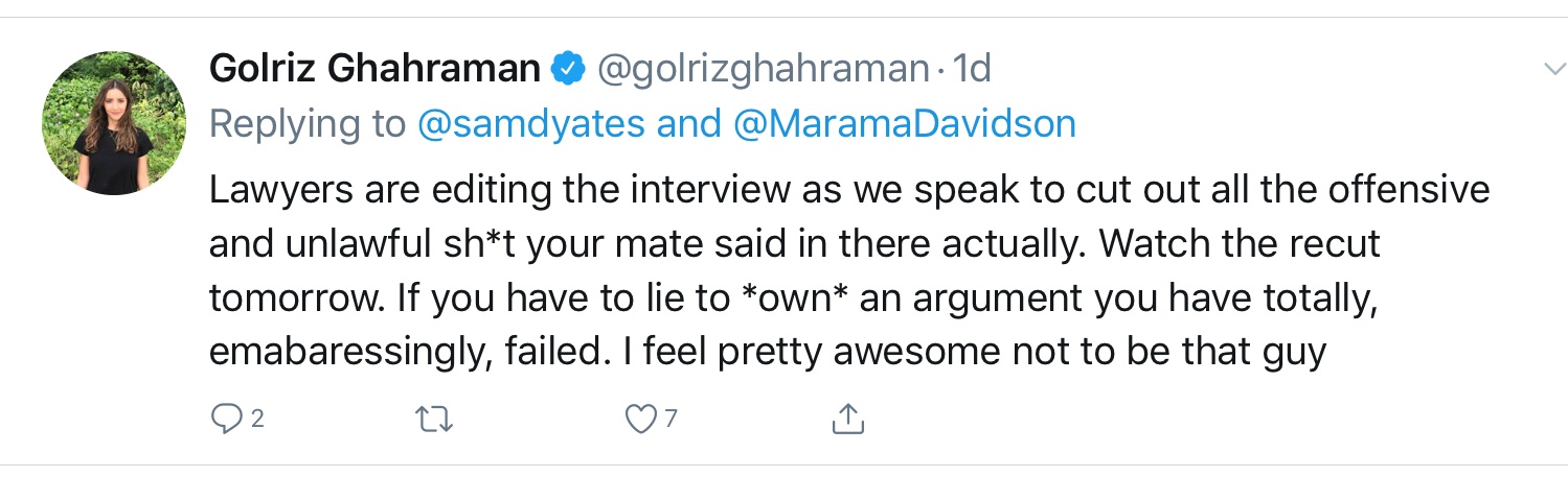 Transcriber’s note on media bias: it is worth watching the video to capture the frequency of Golriz using eye contact to appeal to Newshub Nation interviewer Emma Jolliff who obliges by intervening three times to redirect or close down.