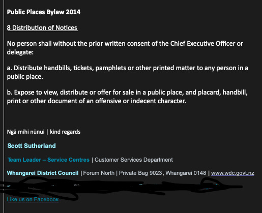 “Whangarei District Council’s bylaw requiring written consent for the distribution of printed materials is an abysmal violation of speech, as is the Council’s insistence on screening the content of the man’s material.”