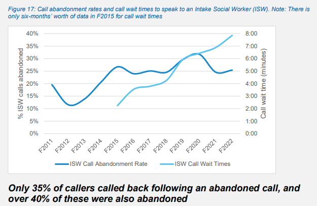 Also examined were social worker non-responsiveness and delays. It was found that Intake Social Worker Full-time Equivalents did not increase in line with higher workloads. Additionally, sick days taken in 2022 were 150% up on the average taken during 2018 to 2021.