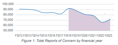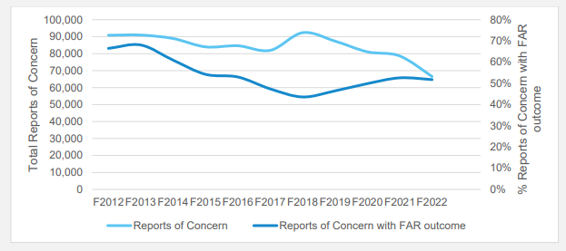 The main pathway through which children come to the attention of Oranga Tamariki is through Reports of Concern which have decreased 28% from 92,351 in 2018 to 66,487 in 2022.