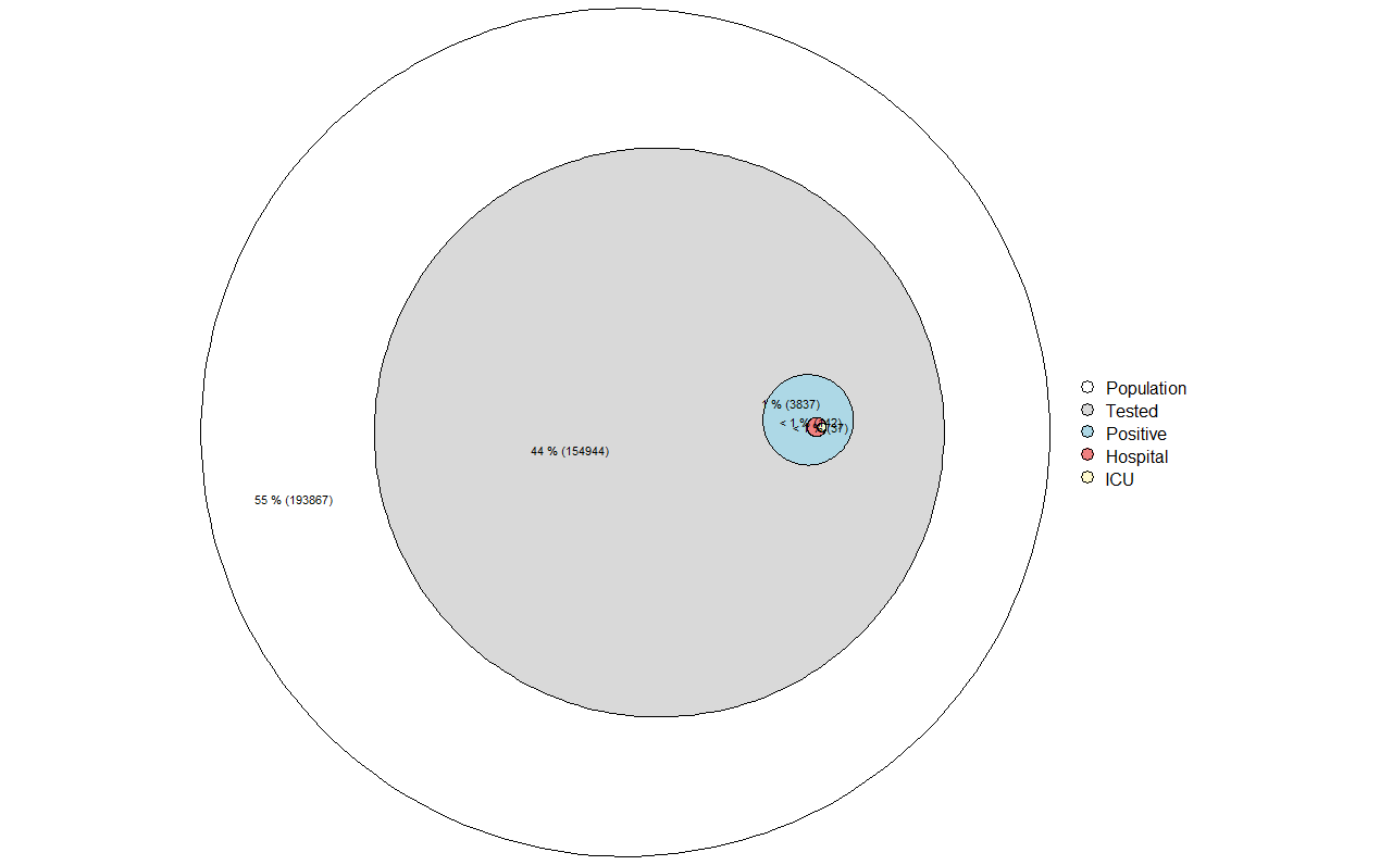 Euler diagrams scale numbers or percentages to an area of a circle or ellipse. Overlapping relationships may also be depicted. The outer circle represents the 356,000 population of the Nordic country, the grey is the roughly 44% of the population who have been tested, the blue indicates the ~4,000 people (2.5% of all tests) who returned positive. The red indicates those who required hospital treatment (~5% of test positives), with the small yellow circle indicating the 1% of test positives who were treated in intensive care.