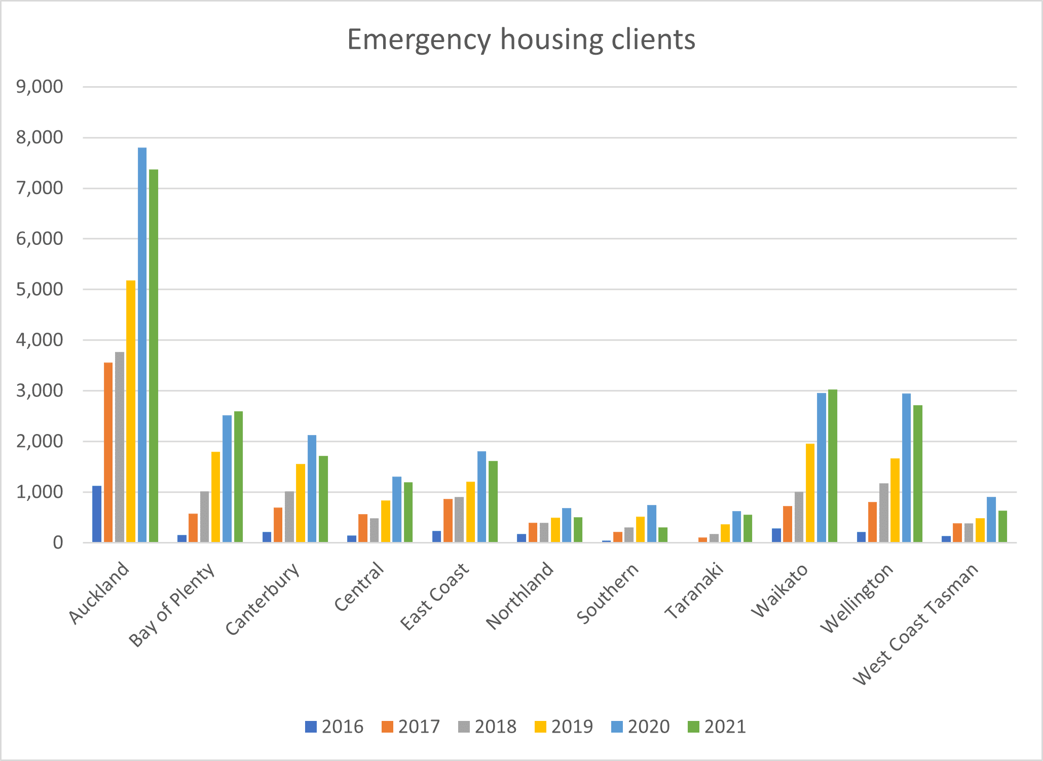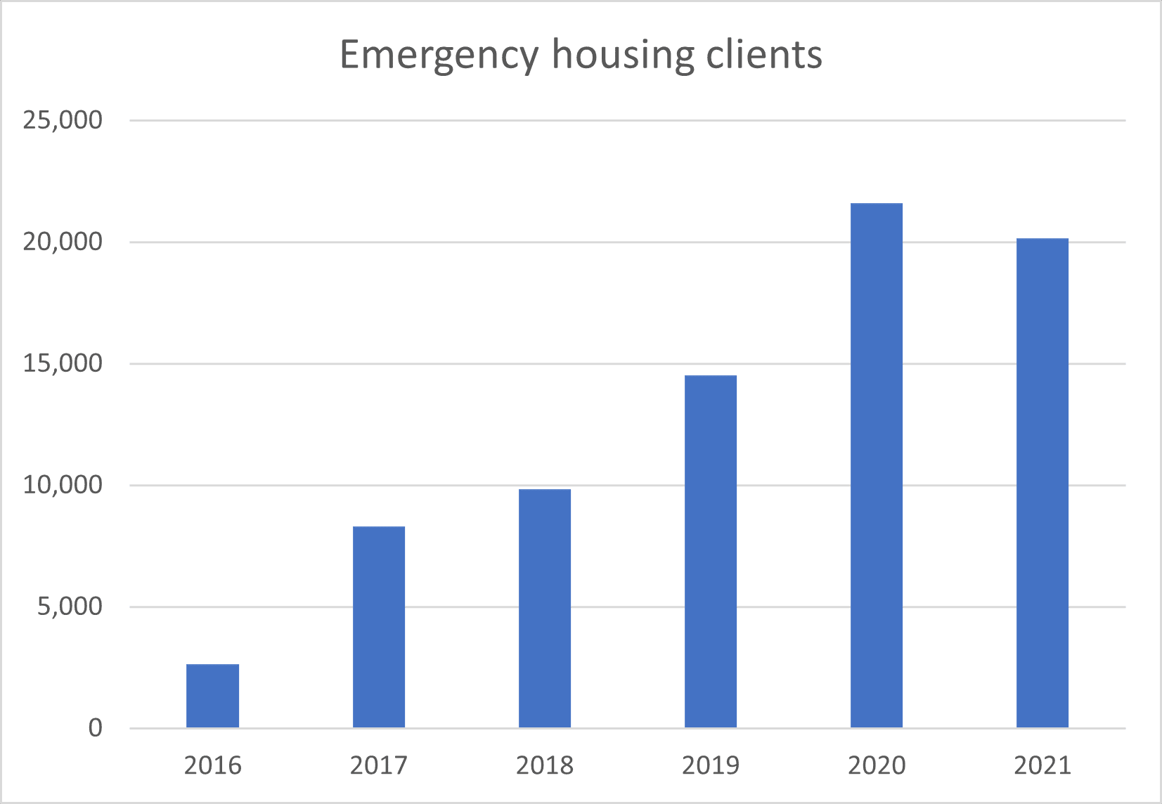 The following graph shows the number of MSD clients living in emergency housing up to 2021: