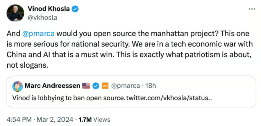 “Would you open source the Manhattan Project?” Khosla fired back.
