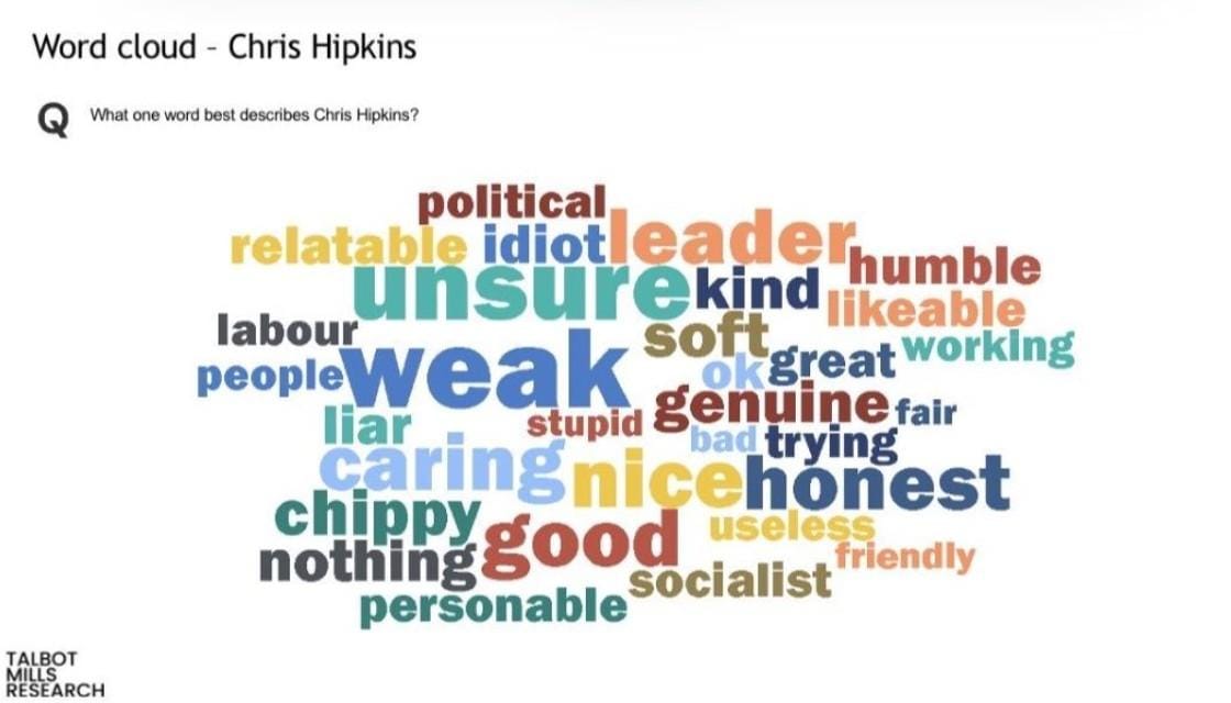 Talbot Mills, Labour’s own pollster, has released a word cloud to its corporate clients about what people think of Chris Hipkins. It’s not flash, with the biggest words being “unsure” and “weak”.