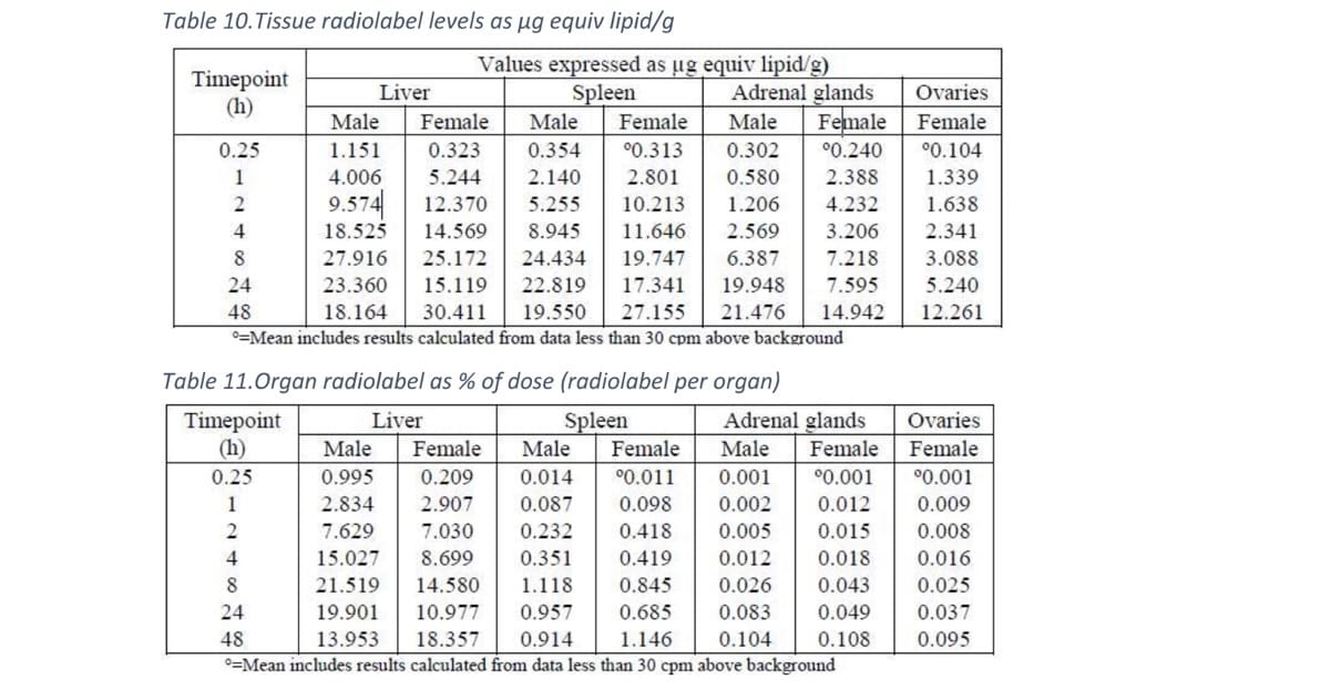 In its Non-Clinical Assessment, Medsafe evaluated a biodistribution study and observed that, “Over 48 hrs radiolabel [lipid] distributed to most tissues but only low levels were found in tissues other than the liver, spleen, adrenal glands and ovaries. The majority of the recovered radiolabel [lipid] was found in the liver as would be expected for a particulate, and the size of the organ, and to a lesser extent, the spleen. Tissue concentrations in the adrenals and ovaries were comparable to the liver and spleen however total recovery from these organs was low due to their comparative size. Levels in the liver and spleen peaked around 8 hours and at around 48 hours for the ovaries and adrenals.”