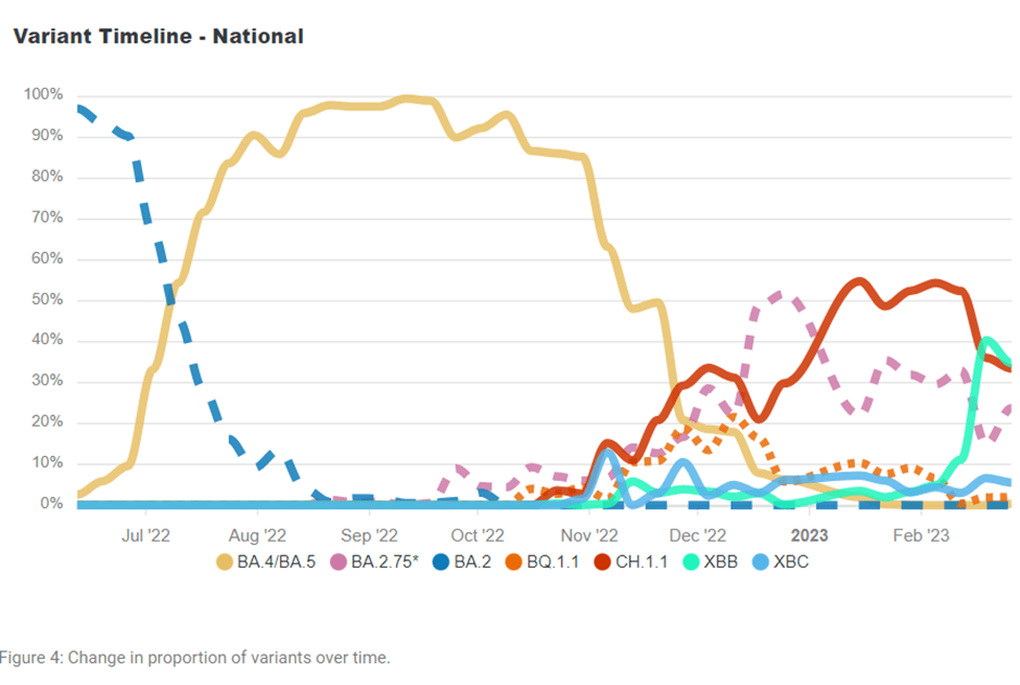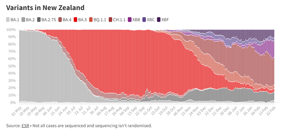 The graph below is from RNZ visualisations as at 7 March 2023 showing variant prevalence.
