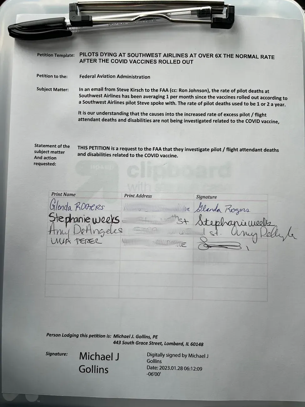 Mike Gollins tried to get signatures on a petition to the FAA to investigate these deaths, but found that even though people agree this is important to investigate, they were too afraid to sign the petition: