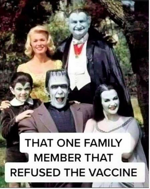 The funniest meme I received lately was passed along by Kevin Stroud. It was a picture of the Munsters, including Marilyn, the blonde, normal-looking, member of the group. The caption read: “That one family member who refused the vaccine.”